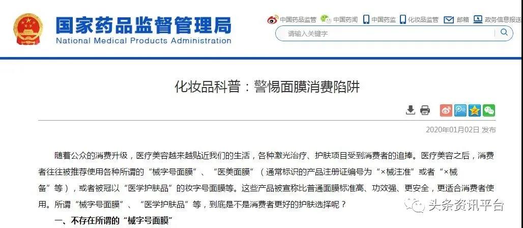 2020年1月2日,国家药品监督管理局发布了一篇题为《化妆品科普:警惕面膜消费陷阱》的公告。公告指出,不存在所谓的“械字号面膜”,“械字号面膜”其实是医用敷料,属于医疗器械范畴。按照医疗器械管理的医用敷料命名应当符合《医疗器械通用名称命名规则》要求,不得含有“美容”、“保健”等宣传词语,不得含有夸大适用范围或者其他具有误导性、欺骗性的内容。因此,不存在“械字号面膜”的概念,医疗器械产品也不能以“面膜”作为其名称。