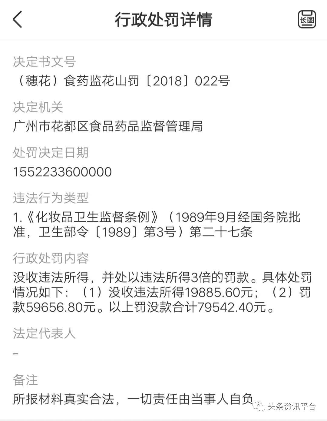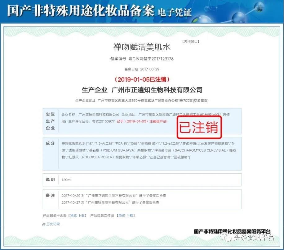 说到这两家生产厂家,调查发现,在去年的3月份,广州慈康生物科技有限公司曾因违反了《化妆品卫生监督条例》第二十七条遭到了广州市花都区食品药品监督管理局的行政处罚。