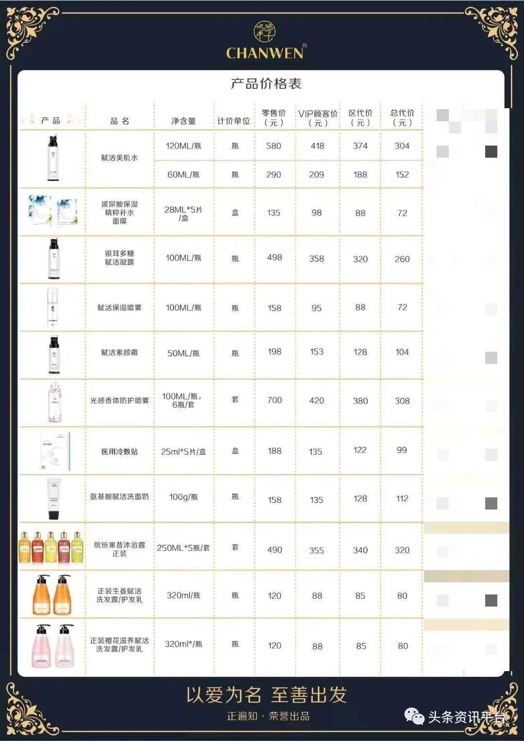从上图中,我们可以清楚地看到代理与代理之间、代理与会员之间的差价。我们以零售价为580元的赋活美肌水为例,VIP的拿货价是418元,区代的拿货价是374元,总代的拿货价是304元,董事的拿货价是228元,执董的拿货价就是“出厂价”,即190元。