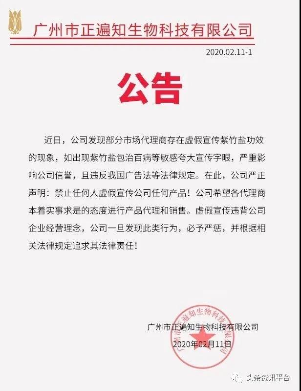 虽说如此,但正遍知公司似乎对虚假宣传现象还是很“重视”的。在前不久,正遍知还专门发了一则公告,公告直指禅吻名下的另外一款产品——紫竹盐,这是怎么回事?据公告显示:近日,公司发现部分市场代理商存在虚假宣传紫竹盐功效的现象,严重影响公司信誉,违反我国广告法等法律规定。公司严正声明:“禁止任何人虚假宣传公司任何产品!公司一旦发现此类行为,必予严惩,并根据相关法律规定追究其法律责任!”