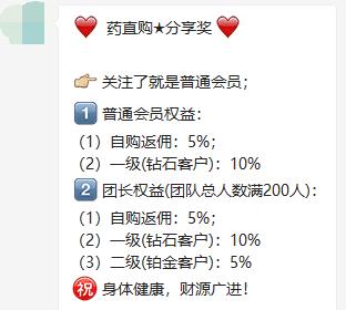 在药直购平台推行的分佣制度中,分为普通会员和团长两个级别。普通会员有两大权益:第一,自购返佣:5%;第二,分享返佣(只有一级):10%。