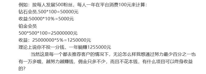 还有资料通过举例的方式,告知合伙人们所应得到的收益会是多少,例如:按每人发展500粉丝,每人一年在平台消费100元来计算,钻石会员500*100=50000元,收益为50000*10%=5000元;铂金会员500*500*100=25000000元,收益为25000000*5%=1250000元。这就是公众号“古田老百姓”所谓的“理论上说你不投一分钱,一年躺赚1255000元”。
