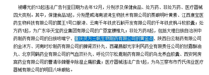 2015年2月,海南省食药监局曝光了13起违法药品、保健食品、医疗器械广告黑名单。据了解,被曝光的13起违法广告刊登日期为2014年12月,分别涉及保健食品、处方药、非处方药、医疗器械四大类别。在非处方药类中,就包括了重庆灵方三帆生物制药有限公司的黄金点。