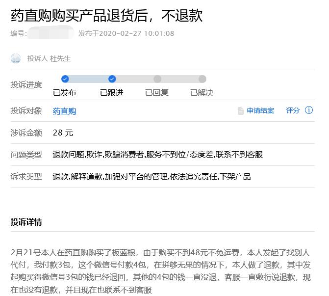 但与此同时,负面消息也接踵而至,2月27日,一位昵称为“杜先生”的用户在“聚投诉”平台上,就“在药直购购买产品退货后不退款”的问题进行了投诉。截止目前,该条投诉仍未被药直购官方处理。