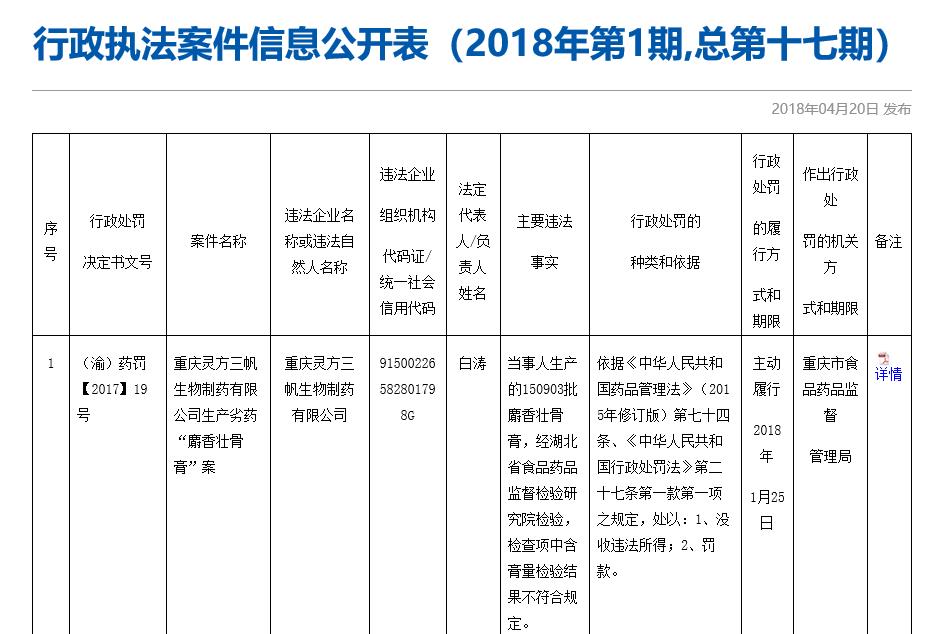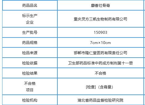 2018年1月,国家食药监总局发布关于9批次药品不合格的通告(2018年第21号),所公示出来的不合格产品的标示生产企业、药品品名和生产批号就包括重庆灵方三帆生物制药有限公司生产的批号为150903的麝香壮骨膏。