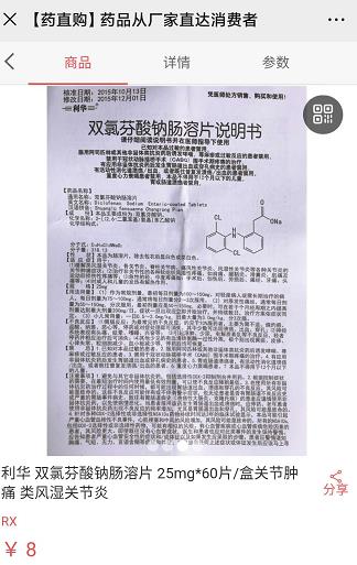 据悉,药直购平台首页还展示有“万种药品,支持全网比价,买贵双倍补差”的字样,接下来,我们再来看看药直购销售的药品是否属于低价,以“利华双氯芬酸钠肠溶片”为例,该产品在药直购平台上的标价为8元,而这款产品(同规格)在某医药网的标价却仅为5.3元。