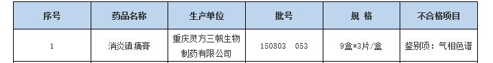 2017年12月,贵州省食品药品监督管理局发布2017年第二期(总第34期)药品质量公告,将2017年上半年抽查检验情况及不合格药品的情况予以公告,贵州省共完成药品抽验共计2216批次,检出不合格药品36批次,不合格率为1.62%。其中,就包括重庆灵方三帆生物制药有限公司生产的消炎镇痛膏,不合格项目为“鉴别项:气相色谱”。