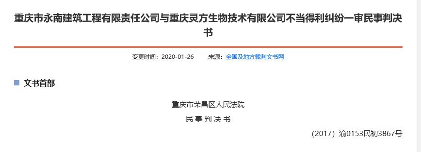 而在不久前,重庆灵方生物技术有限公司刚因“不当得利”被重庆市永南建筑工程有限责任公司告上法庭,原告以不当得利为由,请求判令被告返还其向被告支付的1013.6万元及相应利息,本案争议焦点为被告收取上述款项有无法律依据。