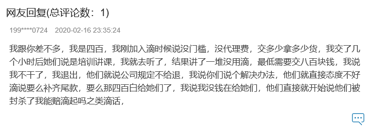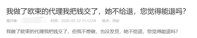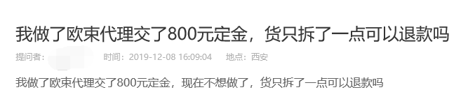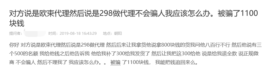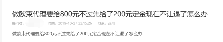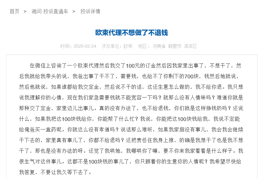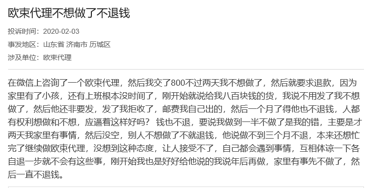 时间来到2020年2月,又出现了一位来自河南省鹤壁市淇滨区的网友以“欧束代理不想做了不退钱”为题进行投诉,另外一个来自山东省济南市历城区的网友也有着类似的经历,只不过是投诉金额从100元变成了800元。时至今日,相关投诉仍处“处理中”。