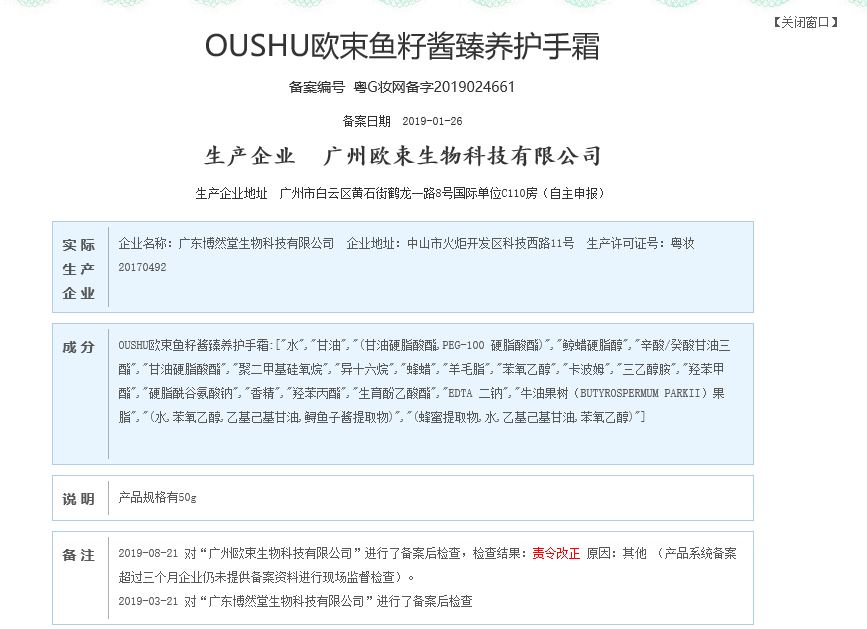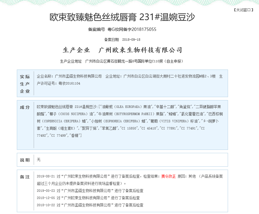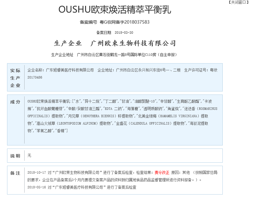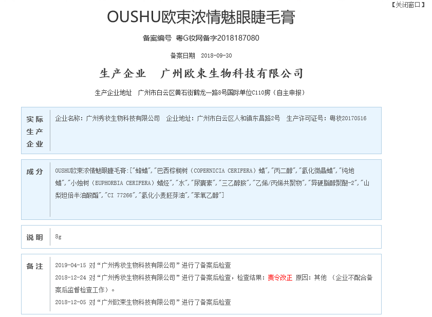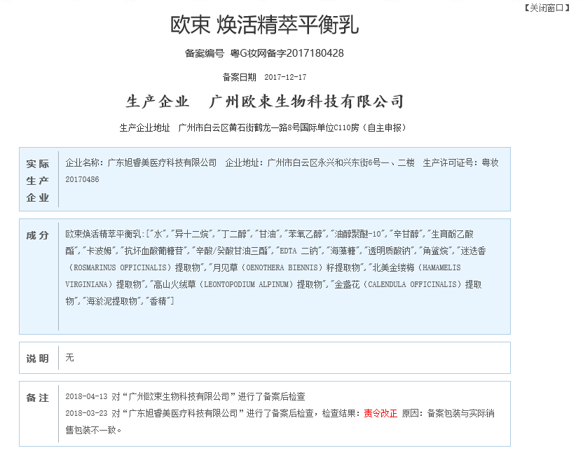 至于欧束名下另外的一些产品,它们遭到责令改正的原因,基本上也都围绕着“产品备案”的方面:“OUSHU欧束焕活精萃平衡乳”遭到责令改正的原因是“按照国家总局的要求,企业在产品备案后3个月内要提交备案产品的资料到归属地食品药品监督管理所进行资料报备”;“OUSHU欧束浓情魅眼睫毛膏”则曾因企业不配合备案后监督检查工作,遭到责令改正;“欧束 焕活精萃平衡乳”被责令改正的原因则是备案包装与实际销售包装不一致。