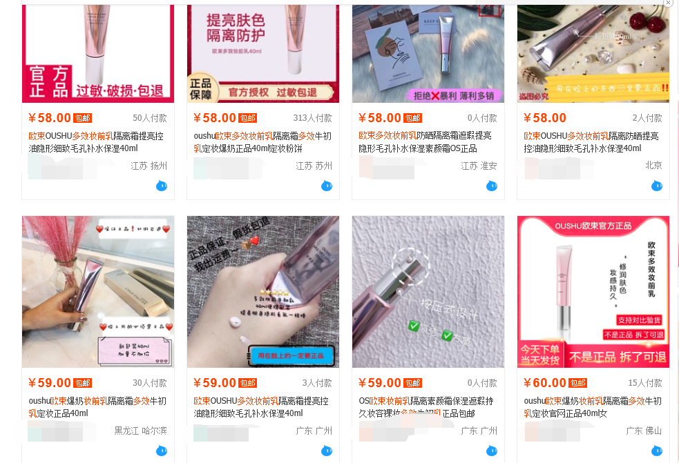 最后,说说产品价格问题。上文中所提到的“欧束多效妆前乳”的统一零售价为169元,而当我们在淘宝上搜索这款产品时,却发现该款产品的标价有58元的、也有60元的,由此推断,在欧束微商团队当中,乱价现象可能已然存在。