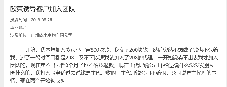 无独有偶,在投诉直通车上,也有多条关于欧束的投诉信息,早在2019年5月,就有网友投诉“欧束诱导客户加入团队”。