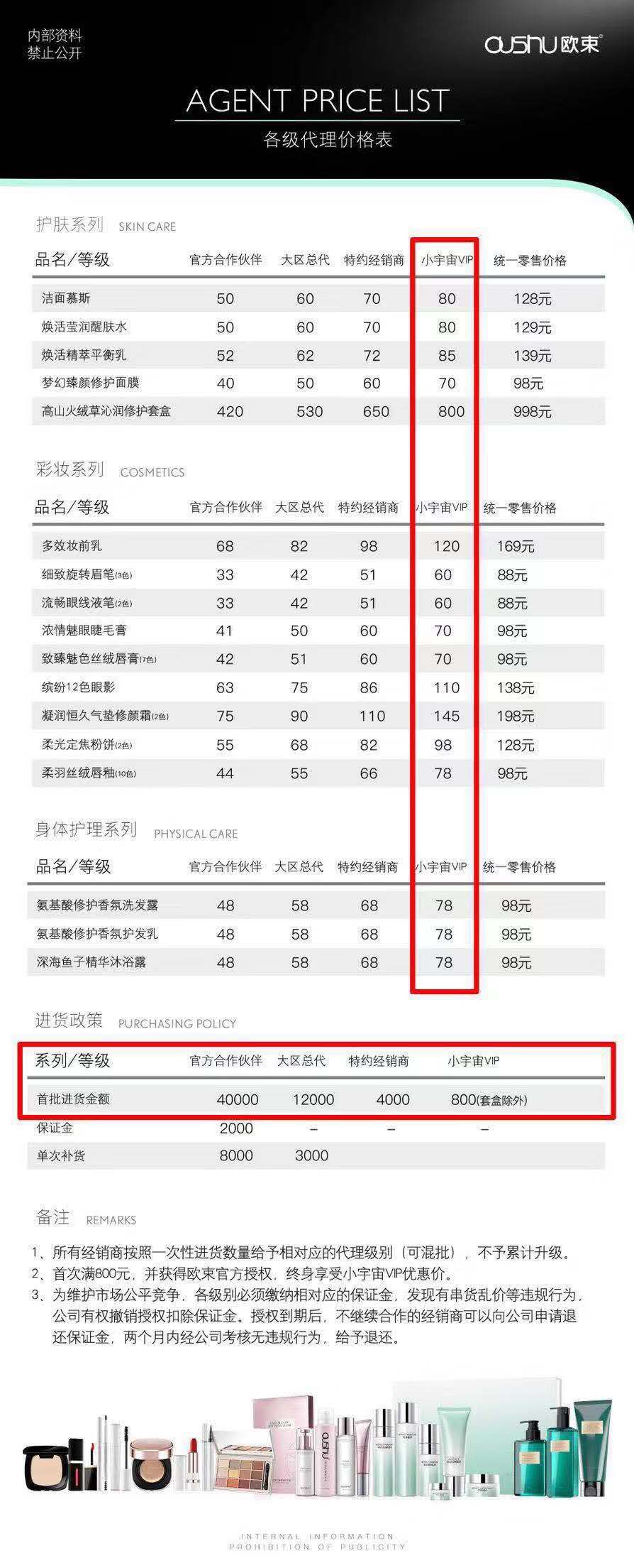 不同代理级别对应的拿货价不同,级别越高拿货价越低,我们以零售价为128元的洁面慕斯为例,小宇宙VIP的拿货价为80元,特约经销商的拿货价为70元,大区总代的拿货价是60元,官方合作伙伴的拿货价仅有50元,而图表中未显示的战略合伙人的拿货价据推算(推算依据:欧束加盟政策)为38元,而这一说法,也得到了某代理商的证实。从128元到38元,其间的利润空间肉眼可见。