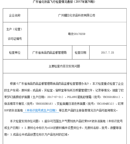 至于广州耀日化妆品科技有限公司,广东省食品药品监督管理局发布的《广东省化妆品飞行检查情况通报(2017年第76期)》曾通报过对广州耀日化妆品科技有限公司的飞行检查情况。据了解,广东省食品药品监督管理局在本次检查中,发现该公司存在超许可范围生产气雾剂类产品欧束EGF液体洁面皂(未标识批号或生产日期)等问题。