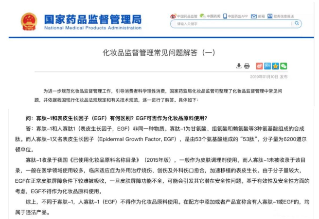 比如欧束液体洁面皂,这款产品被介绍为含有EGF因子,并大肆宣传。诚然,EGF对于皮肤的修复和促生长等方面的确能发挥作用,但是滥用EGF却存在安全隐患。而且早在2019年1月10日,国家药品监督管理局就发表声明对此明确指出:“人寡肽-1(EGF)不得作为化妆品原料使用。在配方中添加或者产品宣称含有人寡肽-1或EGF的,均属于违法产品。”