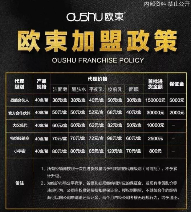 然而,在由某行业媒体于前段时间曝出的另外一个版本的《欧束加盟政策》(上图)当中,我们却发现此政策下的各级代理的门槛与我们在调查中所查找到的制度表有所出入,这是怎么回事呢?据合伙人阿力(化名)介绍,此版本的代理表属于老版本的,不适用于现在,不过该表中的各级代理所对应的拿货价是正确的。