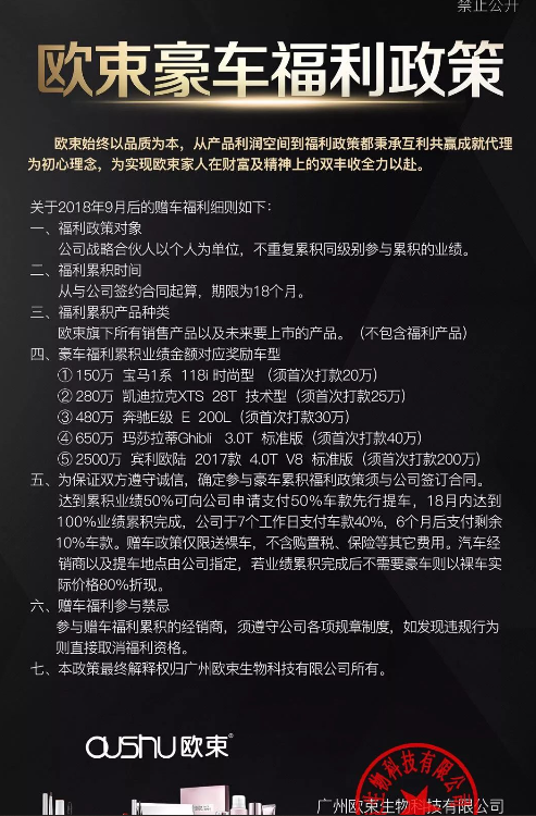 据代理商阿强(化名)介绍,欧束代理商的利润来源主要是代理与代理之间的差价,除此之外,代理商们做到一定的业绩之后还将享有豪车、旅游等奖项。附《欧束豪车福利政策》: