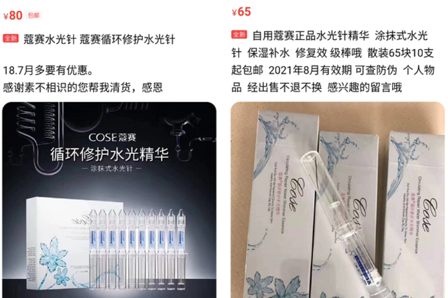 按照知情人的说法,畅销产品水光精华,蔻赛官方零售价580/盒,大区级进货价150/盒。但是很多电商平台甩货价平均80/盒,二手商收购价45/盒。即便价格如此低廉,二手商也要挑三捡四,只要生产日期新鲜的,临近保质期的坚决不要。究其原因,很多人已经意识到了蔻赛产品市场太泛滥,消费者变得不认可,不好卖!