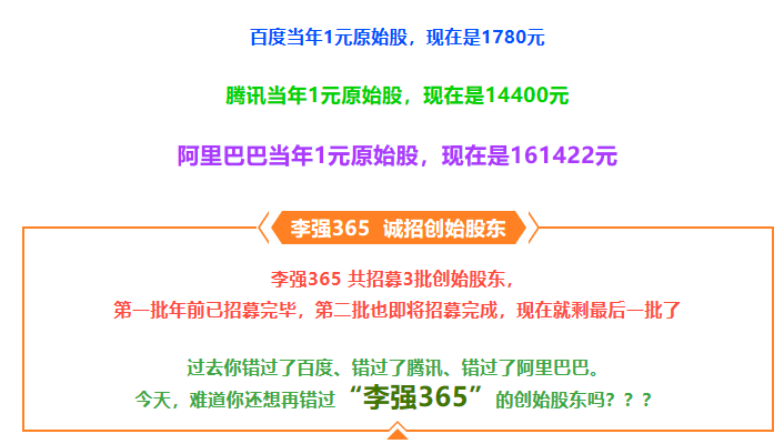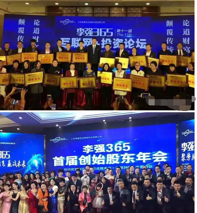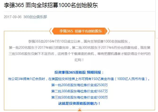 除了拉人进来会有奖励以外,该公司还对外以投资原始股为名大肆宣传,这是我们要说的第三部分:李强365为吸纳公众资金,宣传公司招募股东,每人需要投资20万元,并声称上市后回馈丰厚,该内容在第一部分中也有所体现。据资料介绍,成为李强365集团的分红股东,将享受365集团年度利润15%的红利,企业拿出5%的股权奖给前200名高级合伙人;5%的股权奖给第201到500名;5%的股权奖给501到1000名。