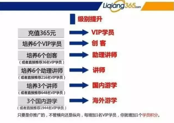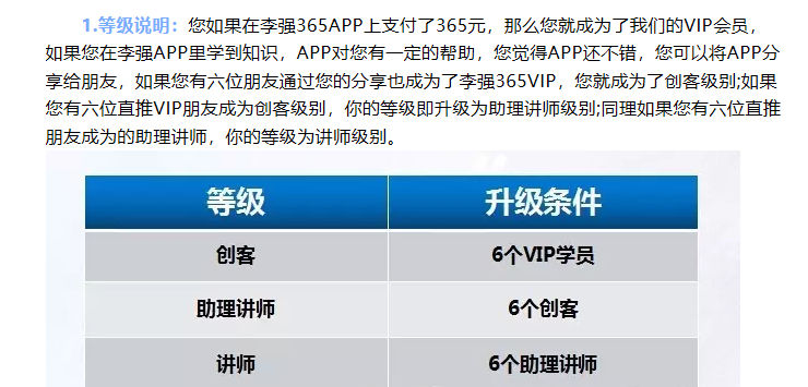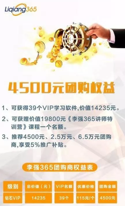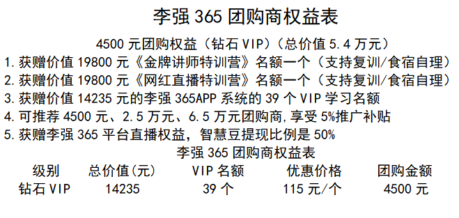 接下来,我们来了解一下李强365到底是采取怎样的模式进行运作的。我们分三个部分去讲,第一部分,除了最基本的365元的会员之外,李强365还推出了五个级别,分别是钻石VIP,联合发起人,高级合伙人,事业合伙人,集团客户创始人。首先,升级为4500元钻石VIP即可参加三天二晚魅力讲师特训营: