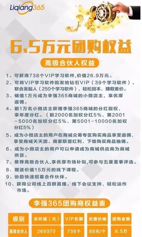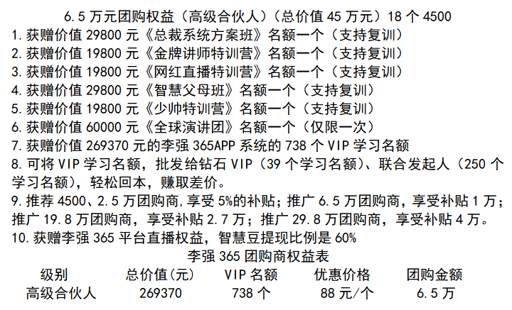 再次,是高级合伙人,升级为6.5万元李强365高级合伙人的会员还可参加全球演讲团。公司会送出738个李强365学习软件,全部销售完毕总收益26937元,除去成本的实际收益为204370元。成为高级合伙人在商城充值一万元现金券还可升级为商城总裁,享受年度分红1~2000名分红5%,2001~5000名分红5%,5001~10000名分红5%。