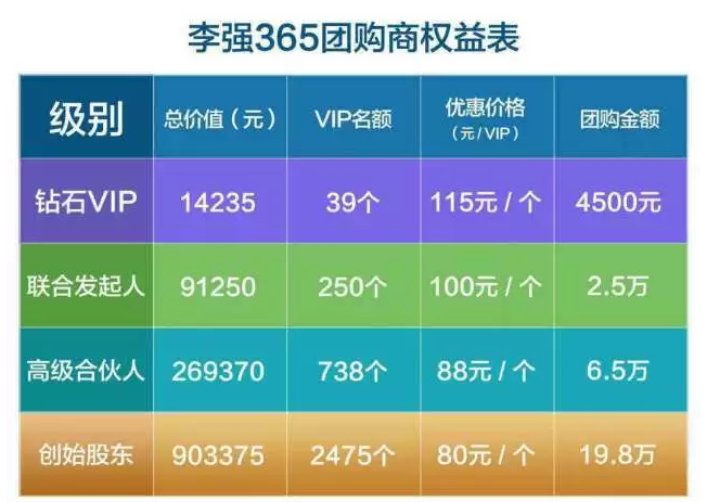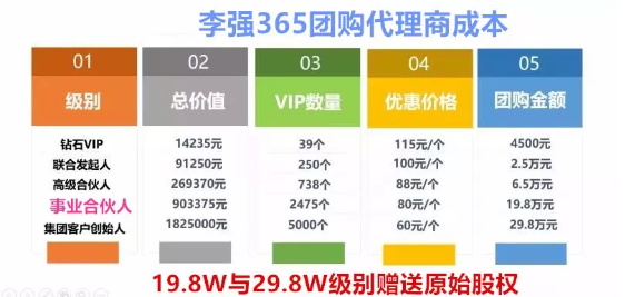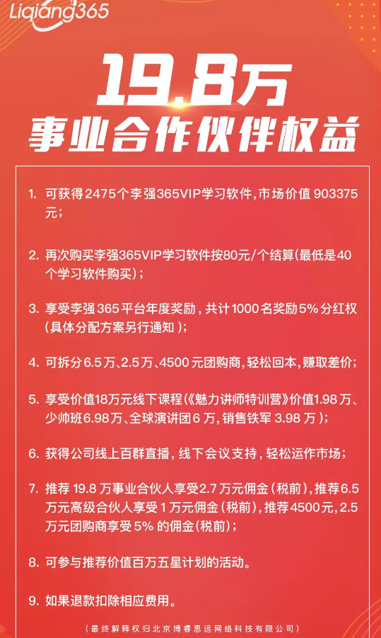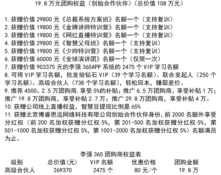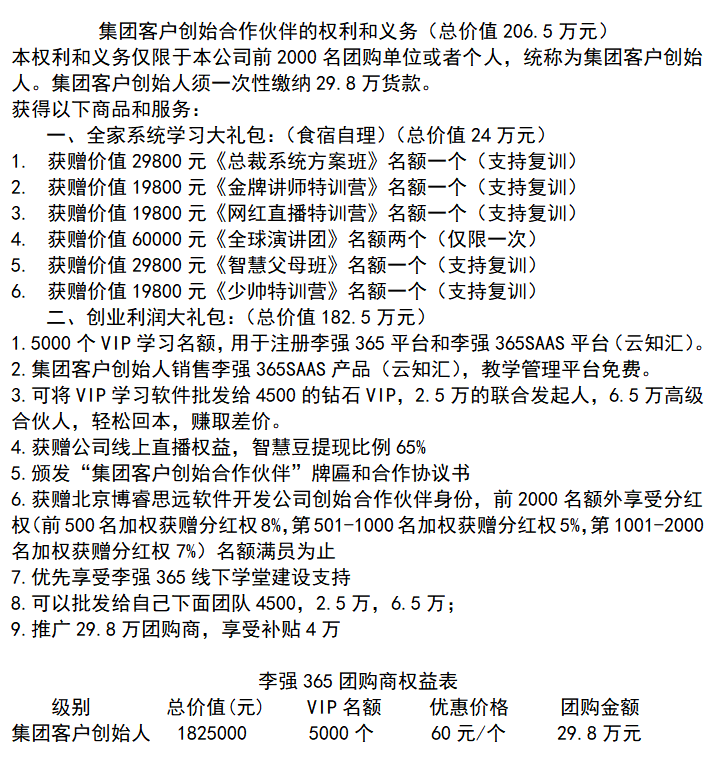 最后,是事业合伙人,也是公司的股东,只招收1000名,招满立停。19.8万元即可升级成为李强365事业合伙人。公司一次性送出2475个软件,全部销售完毕总收益903375元,除去成本,实际收益705375元。事业合伙人可以零售或者批发给团队成员4500元、25000元和65000元,用以回本赚钱,并享有年度分红5%和李强365上市后的红利。