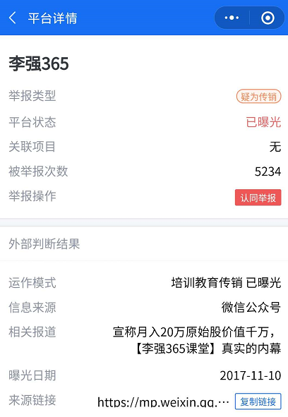 眼下,在腾讯灵鲲金融风险监管平台上,“李强365”这个关键词也已被标记了5234次,标记类型是“疑为传销”,平台状态为“已曝光”。与此同时,在舆情列表中,有新闻以《宣称月入20原始股价值千万,李强365课堂真实的内幕》为标题对其进行过曝光。