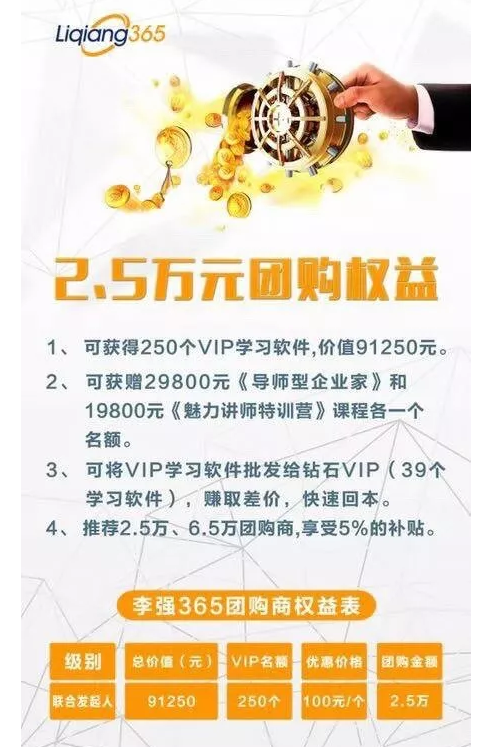 其次,是联合发起人,升级为25000元联合发起人即可参加导师型企业家课程,公司一次性给联合发起人250个李强365学习软件,全部销售完毕总收益91250元,除去成本25000元,实际收益为66250元。
