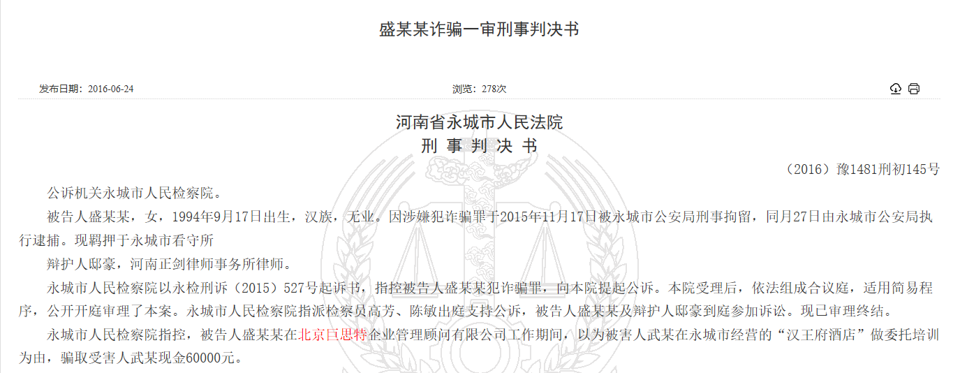 既然说到了巨思特的员工,那我们就此多提几句。2015年,盛某某在北京巨思特企业管理顾问有限公司工作期间,以为被害人武某在永城市经营的“汉王府酒店”做委托培训为由,骗取受害人武某现金60000元。不久,盛某某因犯诈骗罪,被判处有期徒刑三年,缓刑三年;并处罚金10000元。员工以委托培训为由进行诈骗,就算完全撇开法律层面上的关系,公司本身的培训模式恐怕也并不能做到独善其身,正所谓教不严,师之惰,师承一系,近墨者黑,难免受其影响。