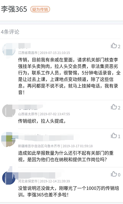 另外,在用户评论页面上,部分用户也在留言中直言不讳地提出了“李强365就是传销、拉人头”的观点。