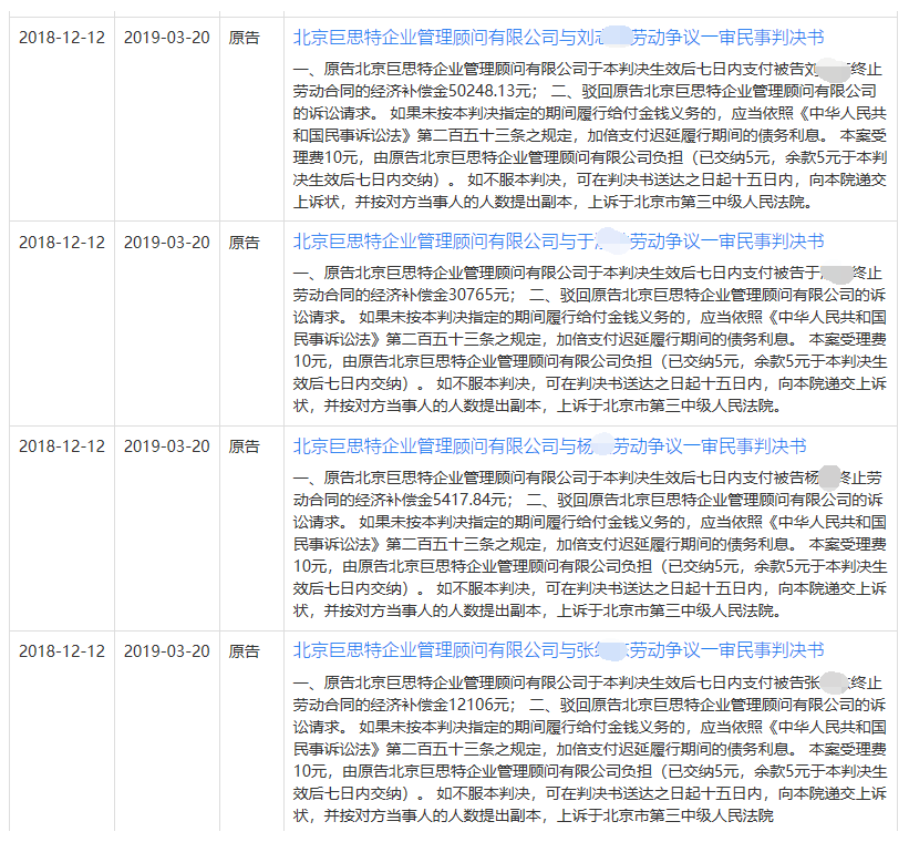 据相关裁判文书披露,多位员工反映,巨思特公司突然找到每一个员工面谈,然后给全体员工开会,宣布停止业务。不少员工据此提交了微信截图证明、办公场所照片及通话录音以证明原工作群解散,巨思特公司原办公地址已经变更为北京博睿思远网络科技有限公司了。巨思特公司对证据的真实性均不予认可,主张因为巨思特成立了新公司,员工自主选择去不去新公司,许多员工选择不去,直接离开了。最终,巨思特公司被法院判决支付给多位员工每人数万元的终止劳动合同的经济补偿金。