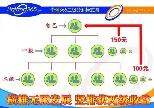李强365在2016年刚刚走入市场的时候,采取的是三级分销,后来改成了二级分销,推荐一级依然是150元,推荐二级变成了100元。据相关资料举例说明:假如每个人每个月推荐了30个会员,主动收入就是150元x30人=4500元,被动收入就是100元x900人=90000元,参与者一个月的总收入就是4500元+90000=94500元。