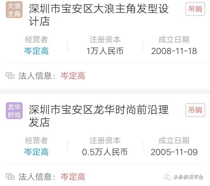 据悉,他开的两家理发店,深圳市宝安区龙华时尚前沿理发店和深圳市宝安区大浪主角发型设计店分别于2005年和2008年成立。而后,其中的一家理发店因连续四年未按规定期限公示年度报告被当地有关部门列入经营异常名录,如今,这两家店都已被吊销了营业执照。