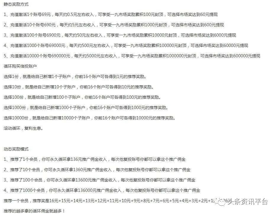 至于动态模式,说白了其实就是发展下线,拉人头。每发展一个下线就激活推荐人16个账户中的其中一个,直到发展16个下线,这16个账户全部激活后,推荐人就可以获得136元的推广佣金,并且对于下线发展的下线,这位推荐人也可以永久拿提成。