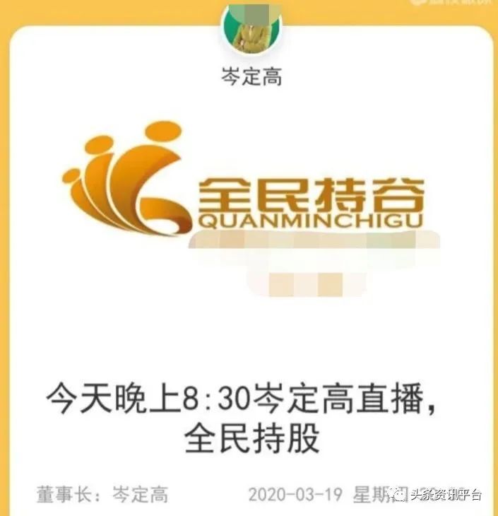 就在刚刚过去的2020年的三月份,董事长岑定高亲自在某直播平台上开课讲述了其模式的具体操作和“全民持股”的由来。按照他的说法,“全民持股”意味着所有人都可以获得原始股成为股东,包括在其APP平台上消费的消费者、入驻的商家,还有运营中心。