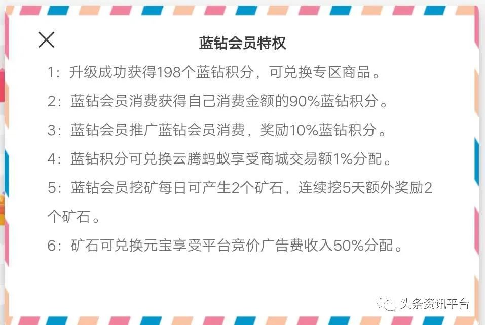 (2)蚂蚁分红:首先会员分为普通会员和蓝钻会员,开通蓝钻会员需要198元。成为蓝钻会员后,可以通过两种方式获得蓝钻积分。第一种,当A开通蓝钻会员之后,A的每一笔消费都可以获得90%的蓝钻积分。第二种,当A推广B成为蓝钻会员之后,那A便能获得B的每一笔消费的10%的蓝钻积分。而这个蓝钻积分可以享受该平台每天交易额的1%的分红,在每个月的28号提现。