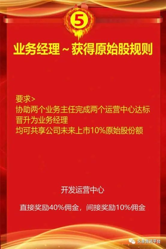(2)之前的那两个成功推广的运营中心如果也去推广其他人,且这两个运营中心都成为精英合伙人的话,那么原来的精英合伙人便能成为高级合伙人(业务经理)。全国将产生713个高级合伙人,公司上市后的原始股的10%,由这713人平分,即每人可以分得7000多万元。