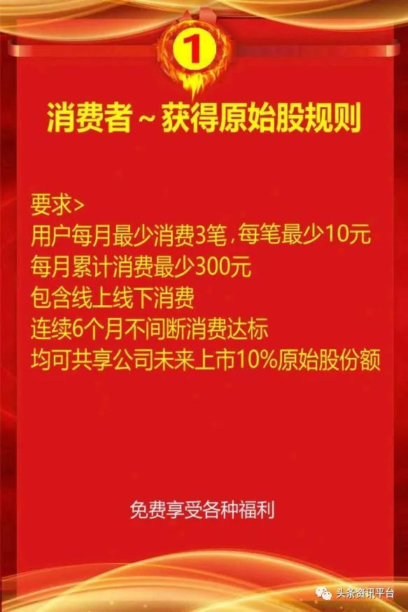 一、消费者:在一九云腾的应用软件上,每个月最少有三笔交易,且消费金额在300元以上,并连续半年的时间,在公司上市后可以享受10%的原始股。