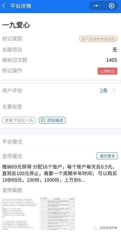 无独有偶,在腾讯灵鲲金融风险监管平台上,“一九爱心”这个关键词已被标记了1405次,标记类型是“用户反馈有传销风险”,且它的主要标签是“发展下线拉人头”。