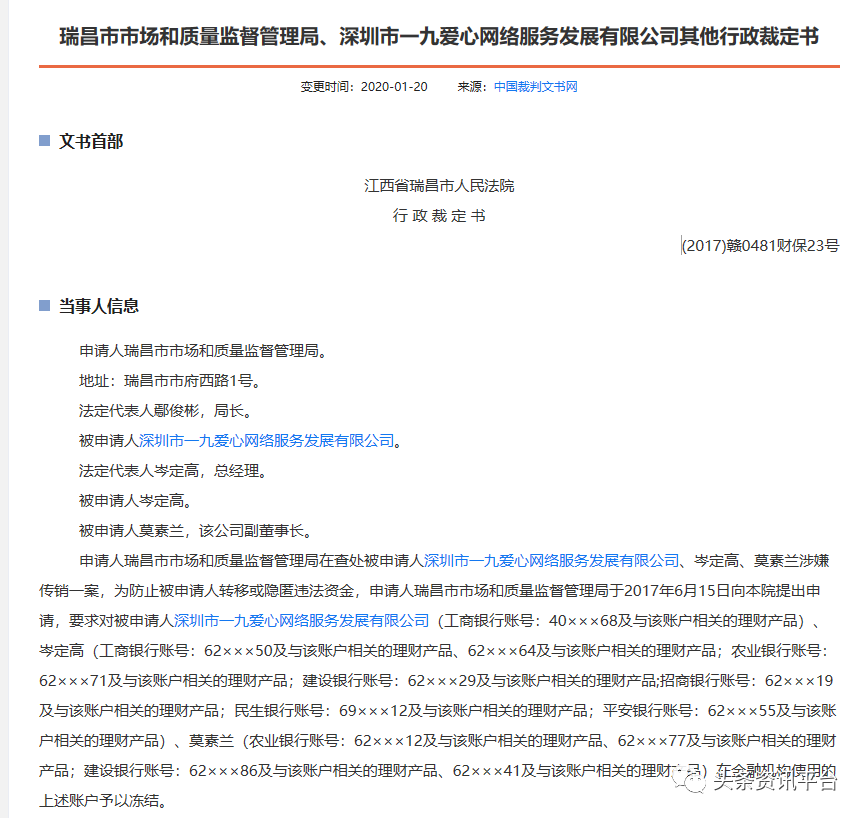 说完了理发师出身的岑定高,我们下面来主要讲讲早已声名狼藉了的一九爱心。经查,深圳市一九爱心网络服务发展有限公司于2014年9月19号成立,目前的法定代表人为王定辉,注册资本5000万元,实缴0元,经营状态为已吊销。吊销原因与该公司的经营模式涉嫌传销有关,早在2017年,岑定高、莫素兰和一九爱心公司的银行账户就已被冻结,据《瑞昌市市场和质量监督管理局、深圳市一九爱心网络服务发展有限公司其他行政裁定书》披露,申请人瑞昌市市场和质量监督管理局在查处被申请人深圳市一九爱心网络服务发展有限公司、岑定高、莫素兰涉嫌传销一案,为防止被申请人转移或隐匿违法资金,要求冻结上述人员与公司的账户以及相关理财产品,江西省瑞昌市人民法院随即予以冻结。