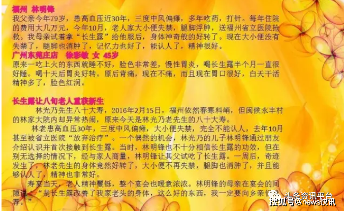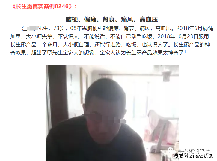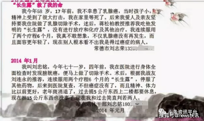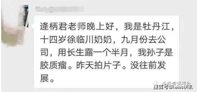 即便如此,但在互联网上还有一些患者服用该产品后痊愈的案例,被公众号“长生露2020”、“燕子长生露”以及其他各种宣传平台或个人用以大肆宣传,在这些长生露推广人员的介绍下,这款产品似乎真的具有了包治百病的功效,比如胶质瘤,子宫肌瘤和卵巢囊肿,食道癌,慢性胃炎,乳腺癌,糖尿病,膀胱癌,偏瘫,肾衰,高血压等病症,似乎都不在它的话下。