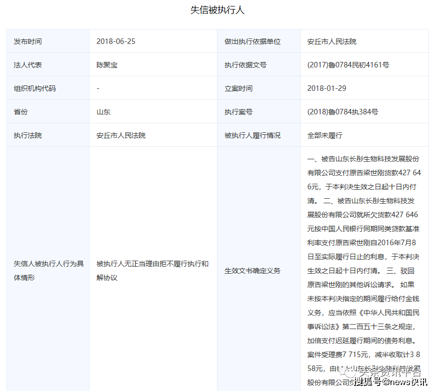 事实上,长彤生物拒不履行确定的法律义务也已经不是第一次了。早在2018年,该公司就因“被执行人无正当理由拒不履行执行和解协议”,被安丘市人民法院列入到了失信被执行人名单,长彤生物也就此成为失信企业,未履行金额为431504元。