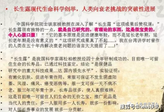 在当下的互联网中,长彤生物出品的长生露系列产品被各种宣传材料介绍为是可以延年益寿、令人返老还童、还能包治百病(如风湿、痛风、癌变恶病、贫血、免疫力低下等)的“神器”。