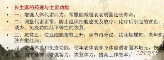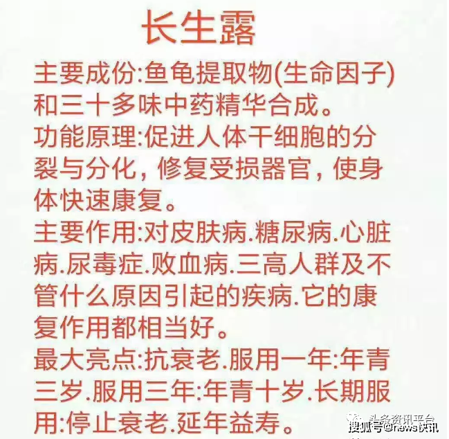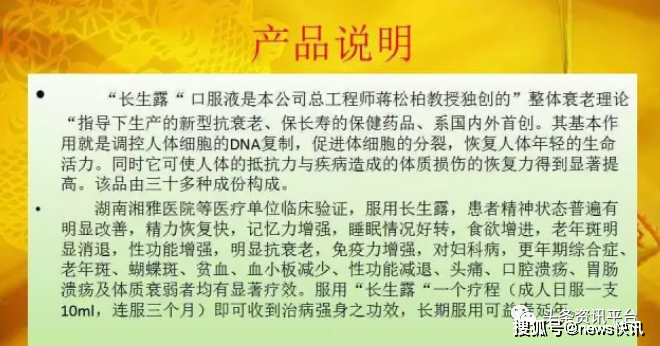 “长生露口服液与所有的保健品都有所不同,它有优于药品的治疗作用,却没有药物的副作用。它具有快速修复身体细胞、激活细胞、再生细胞、延阻分化细胞衰老的功效!不管什么疾病,都是细胞变异衰老的问题,只要细胞健康了,身体自然就健康了。所以,长生露口服液能让疾病不治而愈,自然康复!可以让人延年益寿逆生长,具有美容养颜,无疾而终的神奇功效……”