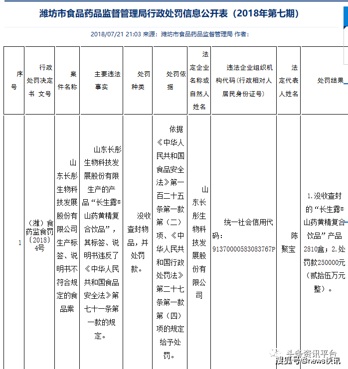 除了诉讼缠身外,该公司也曾不止一次遭到过有关部门的行政处罚:2017年9月,该公司因环保问题遭到了安丘市环保局的行政处罚;2018年6月,潍坊市食药监局发布2018年第七期行政处罚信息,山东长彤生物科技发展股份有限公司因生产标签、说明书不符合规定的食品案,遭到了处罚,主要违法事实如下:该公司生产的产品“长生露®山药黄精复合饮品”,其标签、说明书违反了我国《食品安全法》第七十一条第一款的规定。潍坊市食品药品监督管理局对该公司处罚如下:1.没收查封的“长生露®山药黄精复合饮品”产品2810盒;2.处罚款250000元。