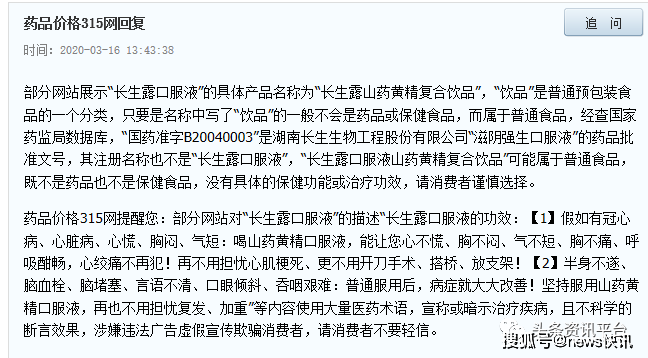 对于网友关于长生露实际功效的质疑,药品价格315网的回复是:部分网站展示“长生露口服液”的具体产品名称为“长生露山药黄精复合饮品”,“饮品”是普通预包装食品的一个分类,只要是名称中写了“饮品”的一般不会是药品或保健食品,而属于普通食品,经查国家药监局数据库,“国药准字B20040003”是湖南长生生物工程股份有限公司“滋阴强生口服液”的药品批准文号,其注册名称也不是“长生露口服液”,“长生露口服液山药黄精复合饮品”属于普通食品,既不是药品也不是保健食品,没有具体的保健功能或治疗功效,请消费者谨慎选择。