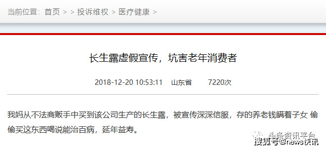 正如在中国质量万里行网站上,被网友投诉的那样:“长生露虚假宣传,坑害老年消费者”,该网友还表示:“我妈从不法商贩手中买到该公司生产的长生露,被宣传深深信服,存的养老钱瞒着子女偷偷买这东西喝说能治百病,延年益寿。”