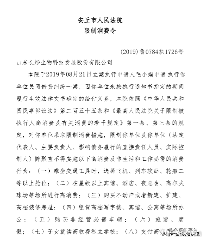 据了解,该公司的法定代表人陈聚宝已经先后被安丘市人民法院出示了两次“限制高消费令”。