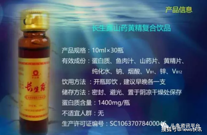 据悉,在当下的市面上,与长彤生物公司有关的产品基本上分为两种,分别是药品“滋阴强生口服液”(国药准字B20040003),以及普通食品“长生露山药黄精复合饮品”(SC10637078400046)。后者几乎就是“长生露”这个品牌的代言人,各种宣传材料在介绍长生露时,都以推崇、销售该饮品为主。有资料显示,中国科学院院士、纽约科学院名誉终身院士、中国生命科学奠基人谈家帧称赞长生露是“唯一有科学研究根据的长寿之药,领先世界20年”。而这里的长生露,指的也是后者。