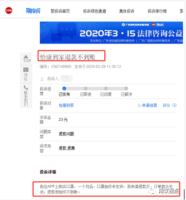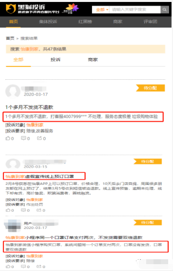 2020年3月29日,有消费者在聚投诉平台发帖称,“在怡康到家APP上购买口罩,一个月后,口罩始终未发货。申请退款后,订单显示关闭,退款却始终不到账。”